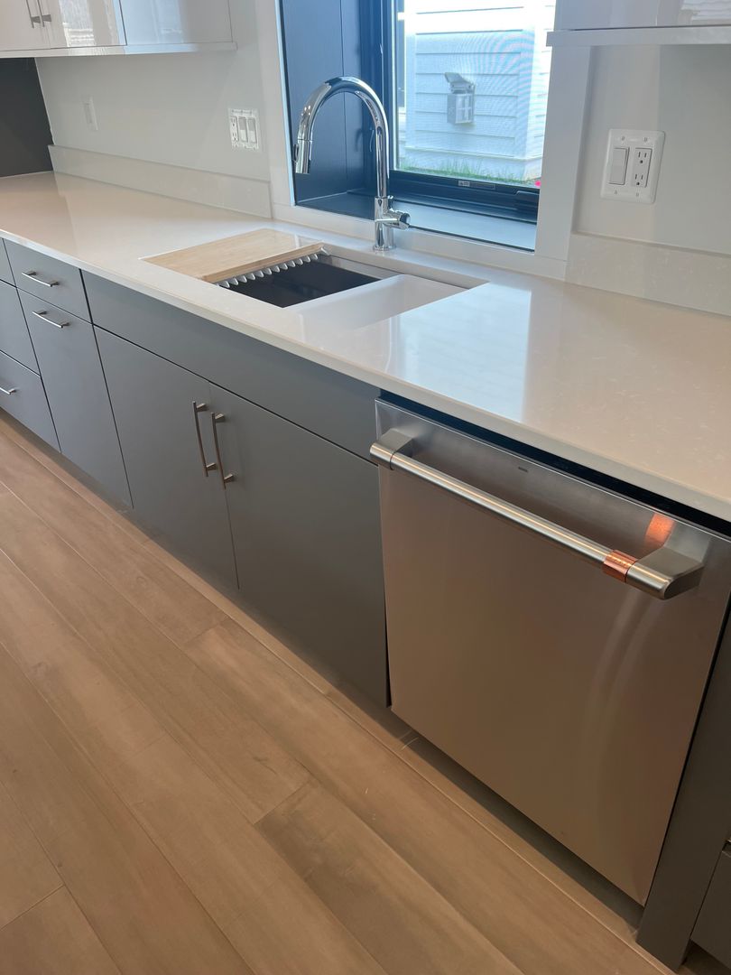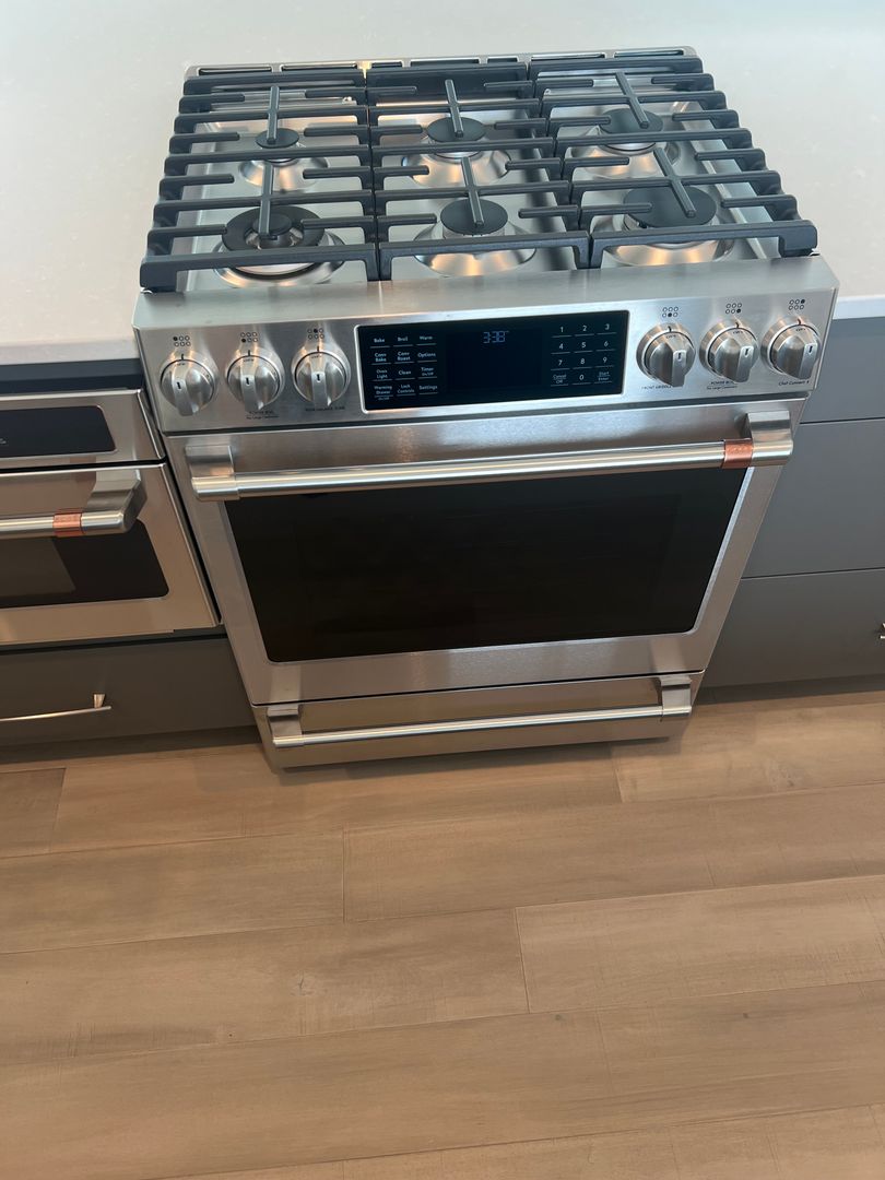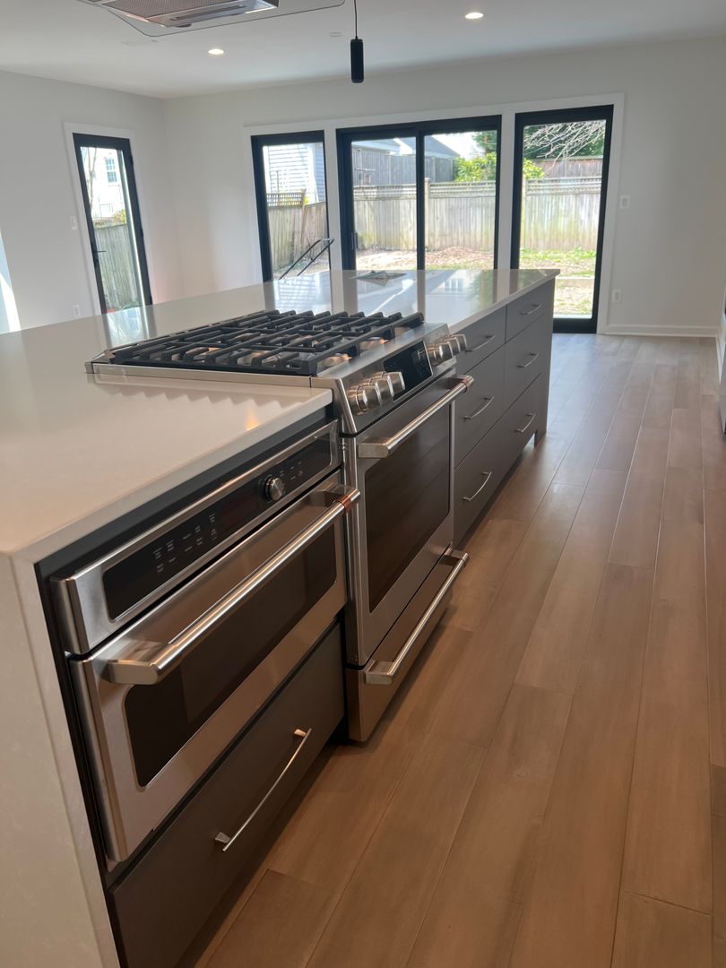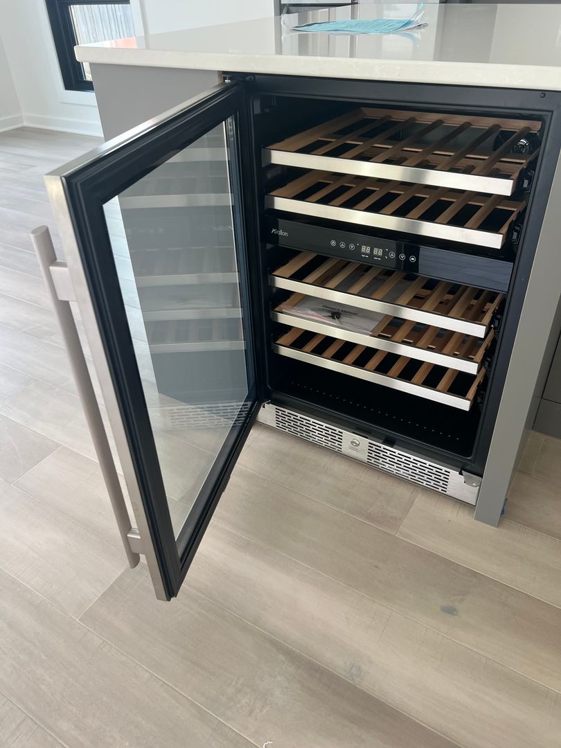 Modern gourmet kitchen with gas cooking, convection oven, and wine fridge