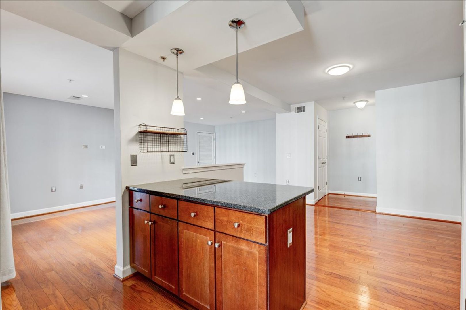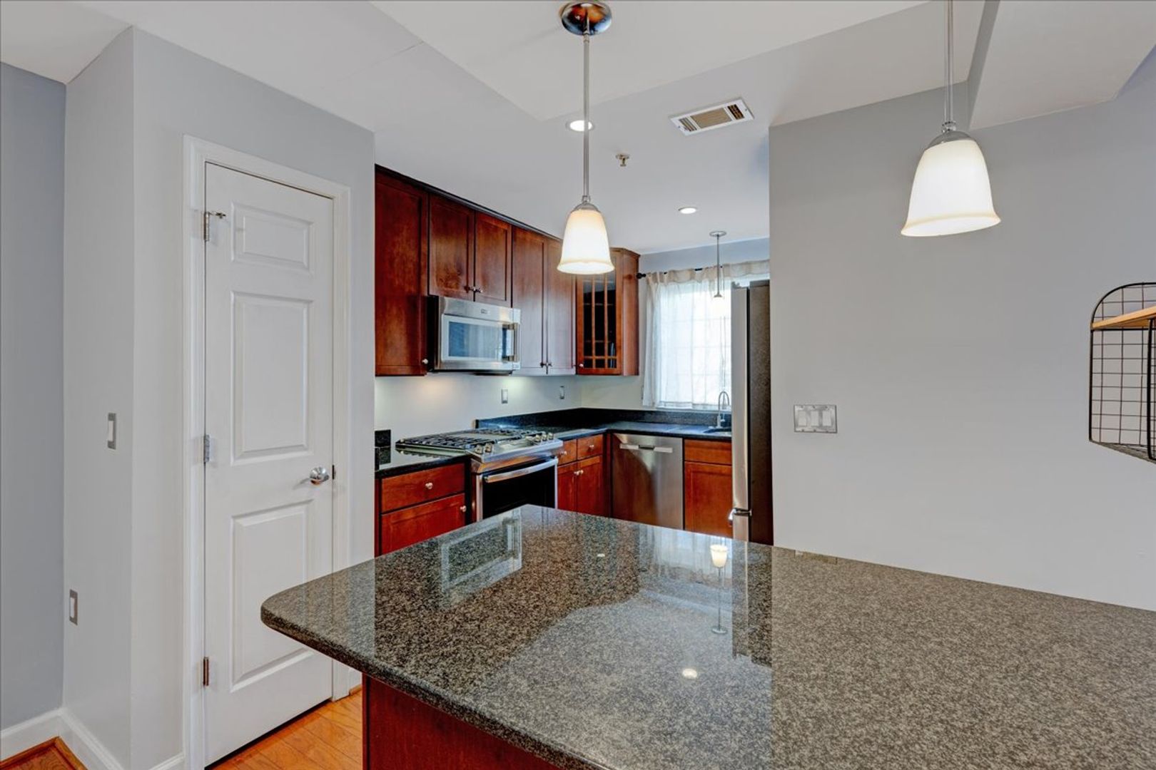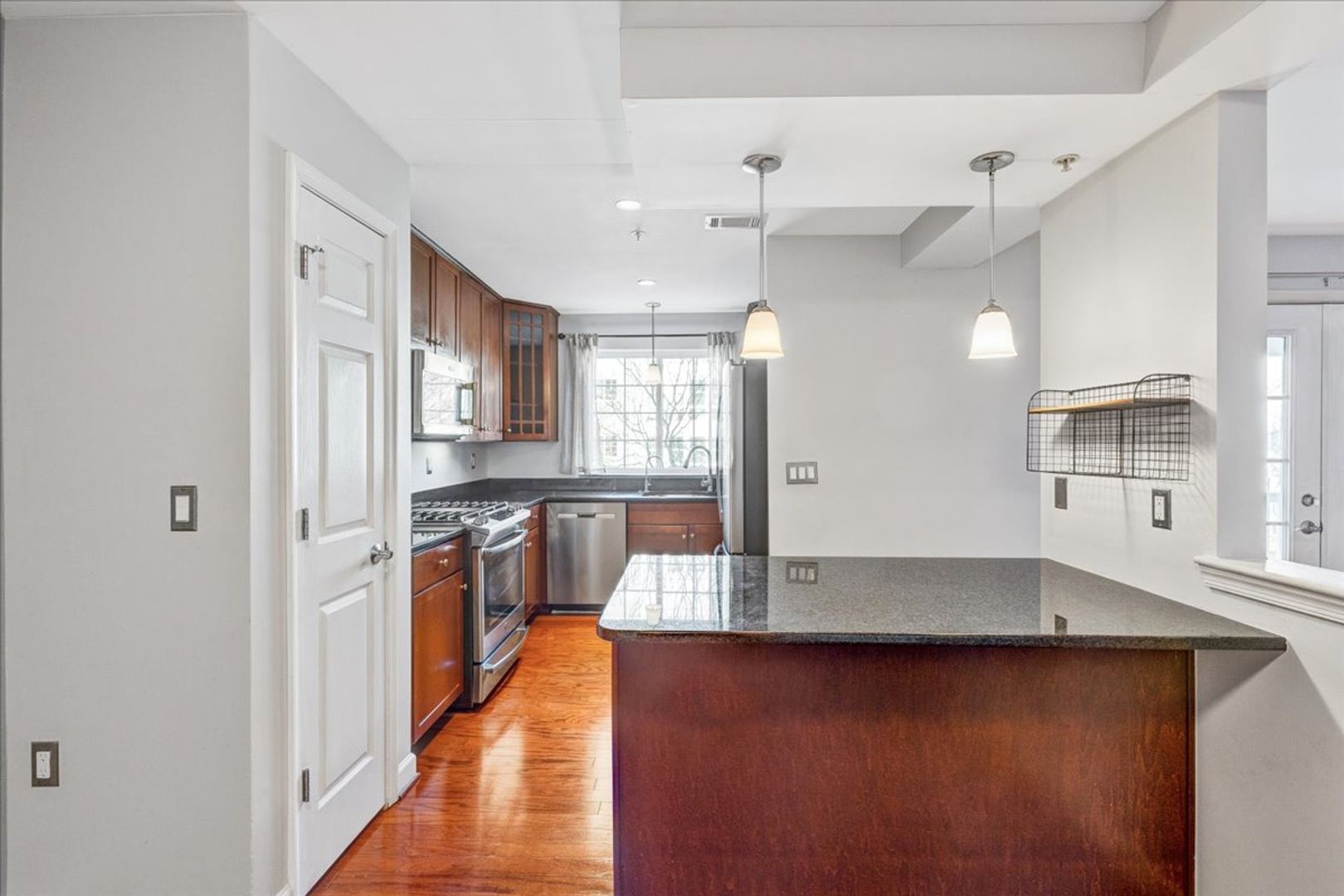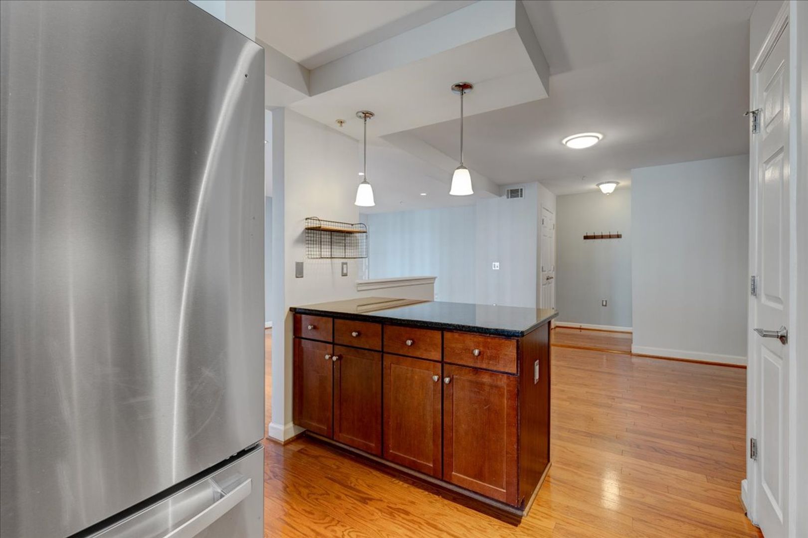 Situated in the charming West Village of Shirlington, this upper-level unit features stainless steel appliances, granite countertops, and chic hardwood flooring throughout. The dining area off the kitchen opens to a spacious balcony from the living room—perfect for relaxing or entertaining.
