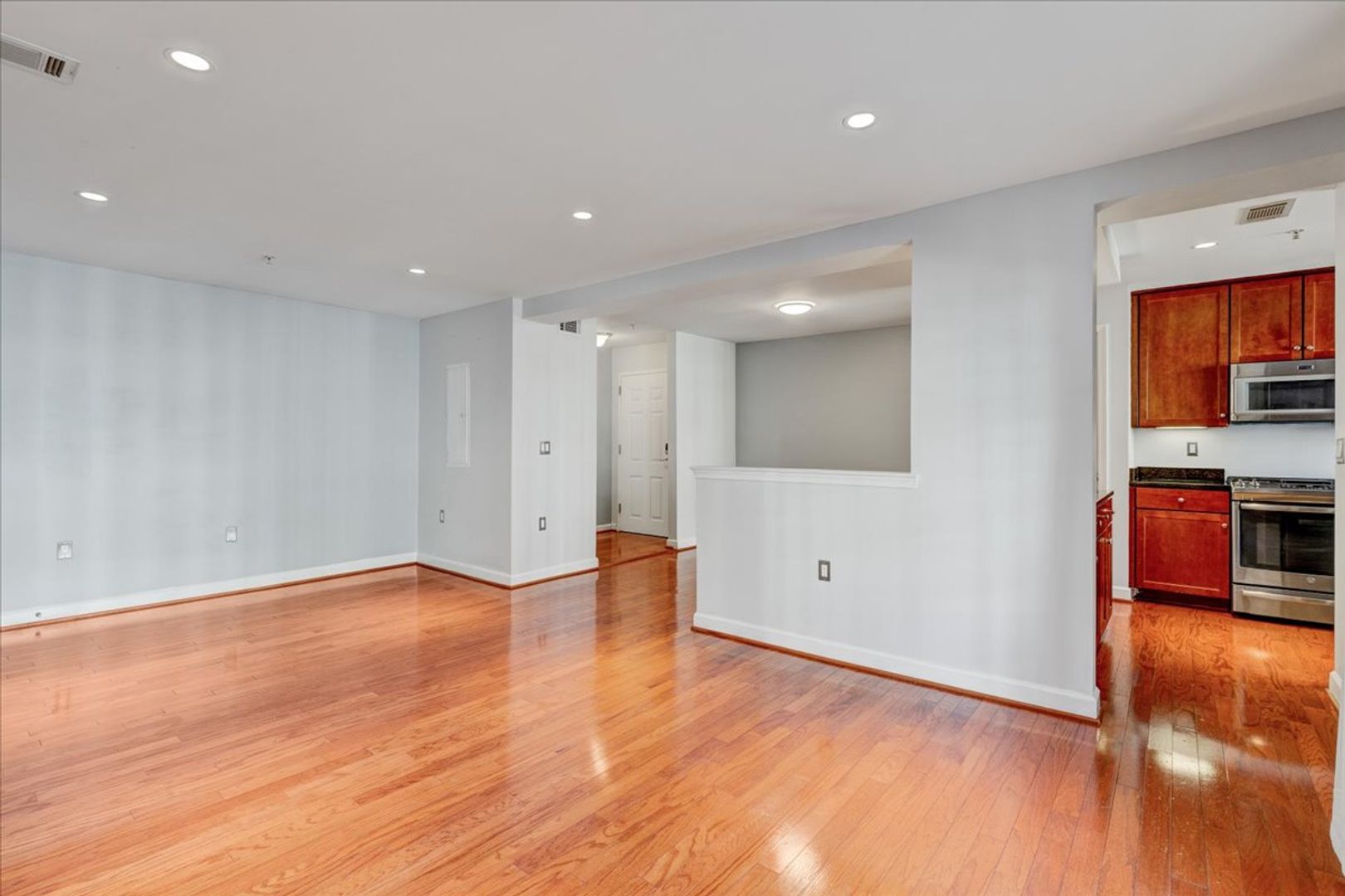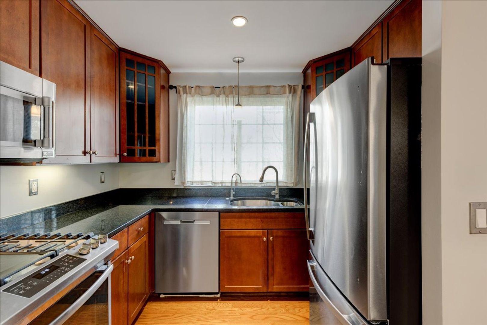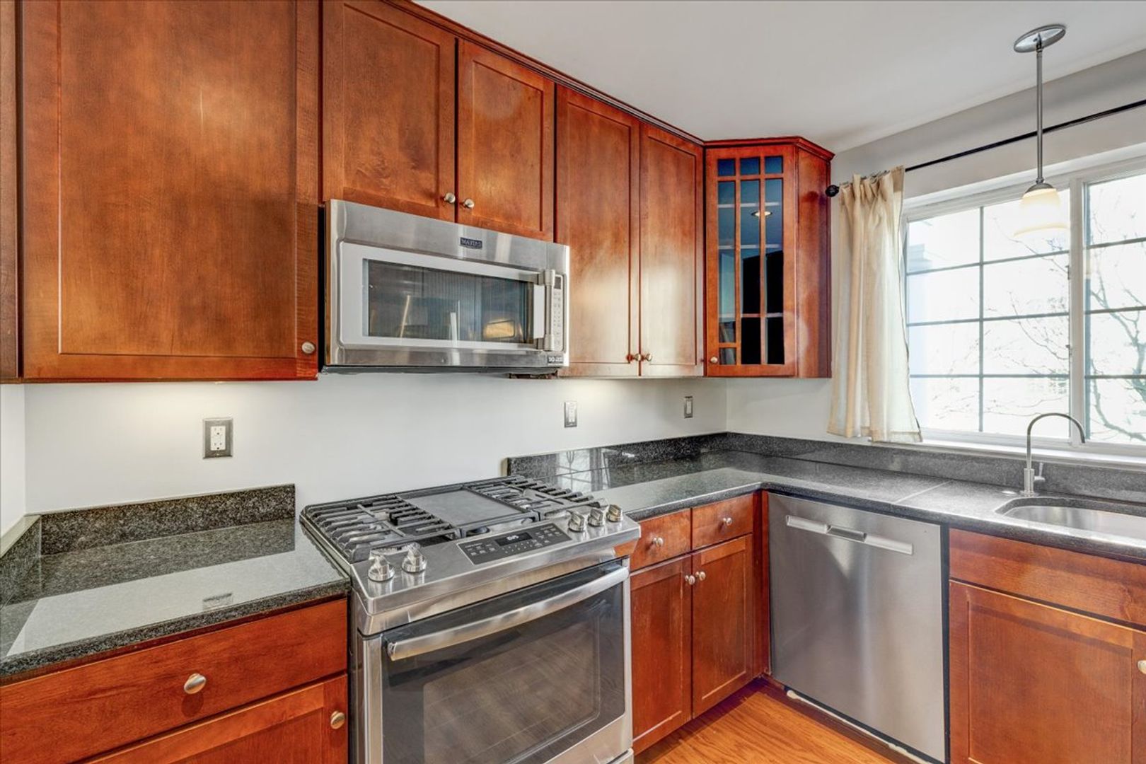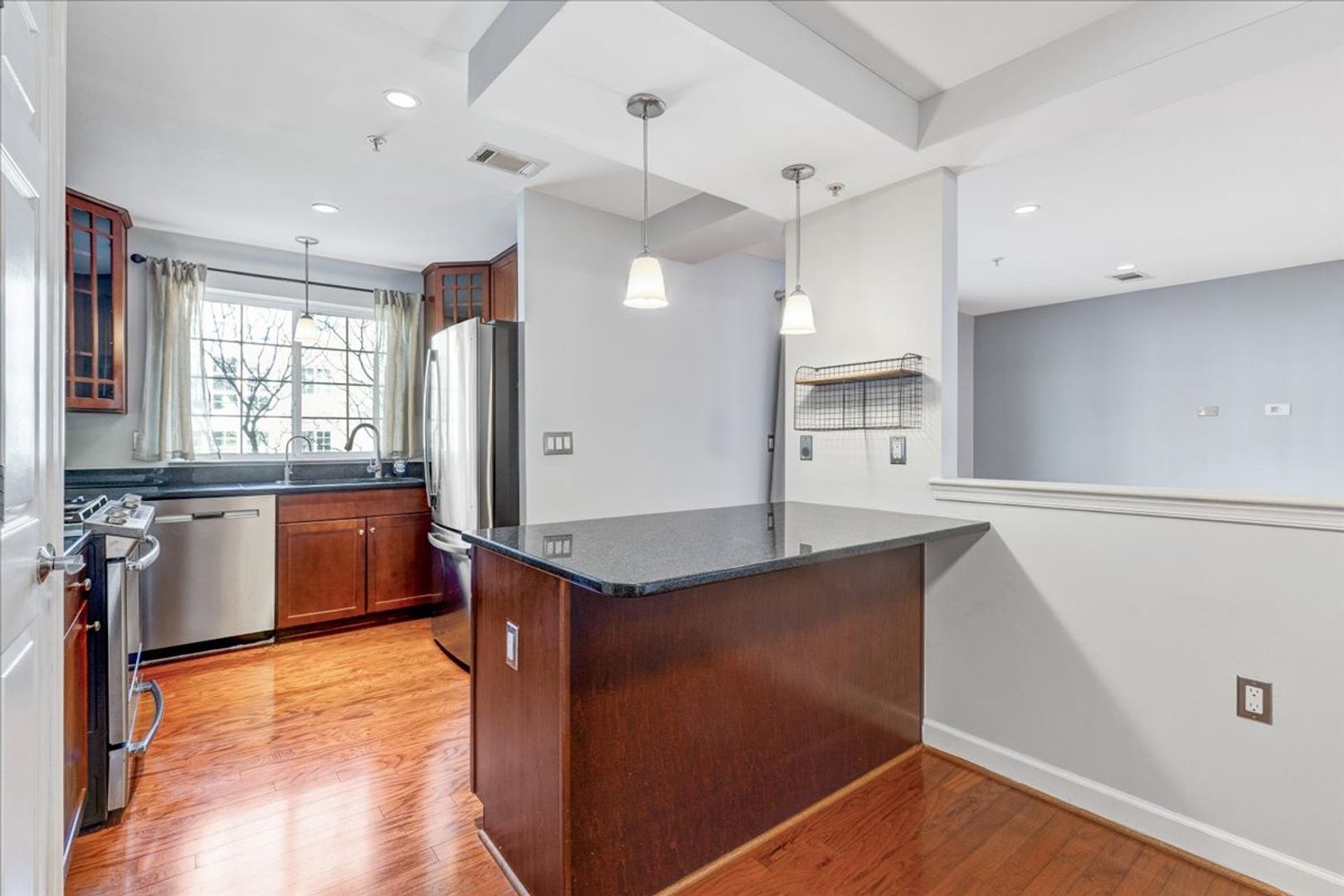 Situated in the charming West Village of Shirlington, this upper-level unit features stainless steel appliances, granite countertops, and chic hardwood flooring throughout. The dining area off the kitchen opens to a spacious balcony from the living room—perfect for relaxing or entertaining.