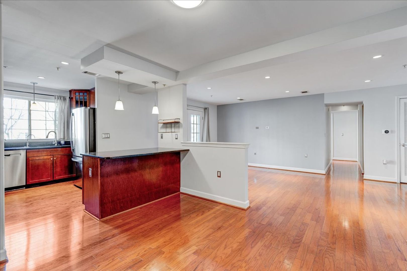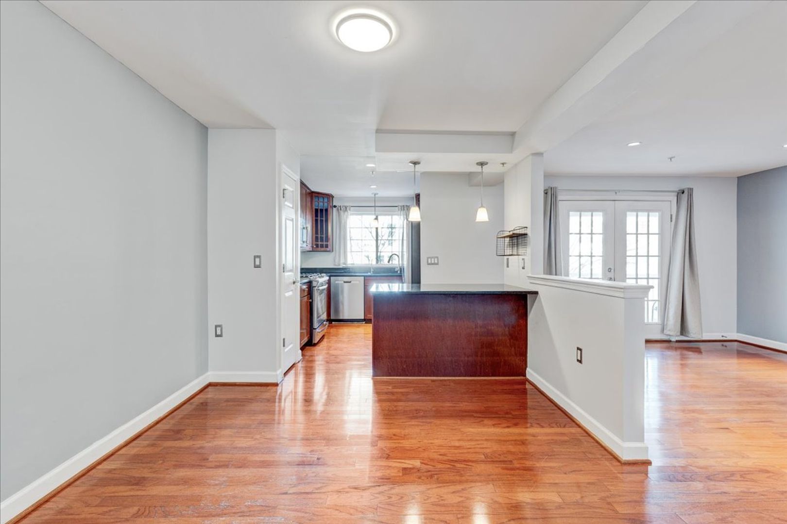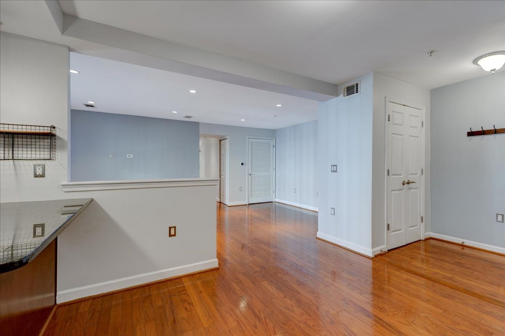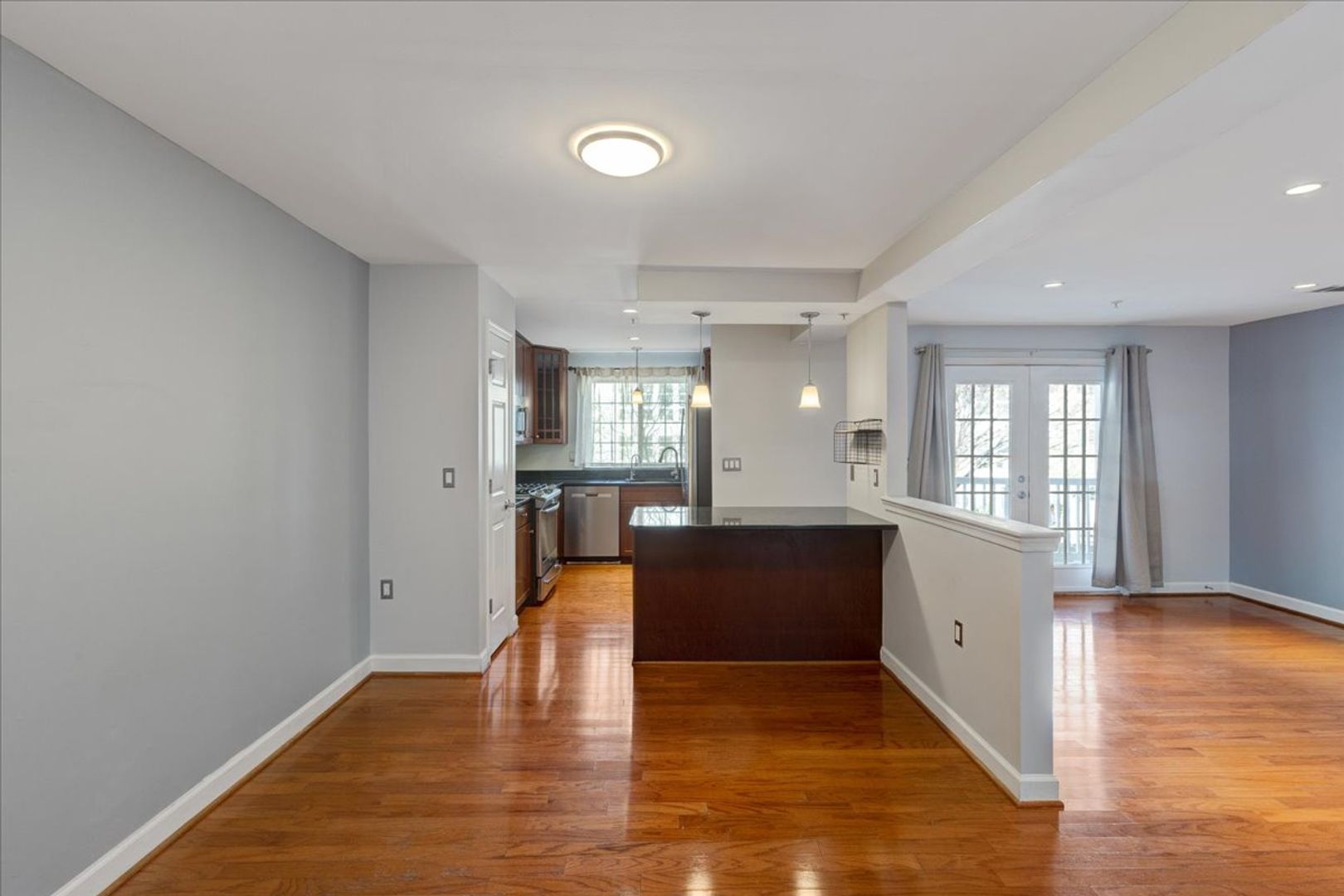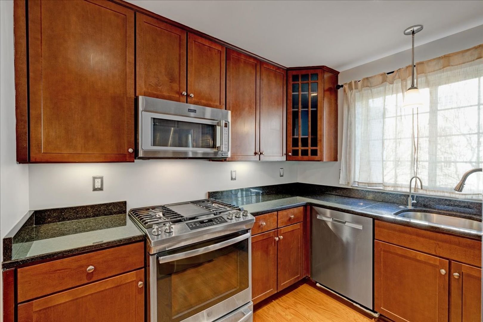 Situated in the charming West Village of Shirlington, this upper-level unit features stainless steel appliances, granite countertops, and chic hardwood flooring throughout. The dining area off the kitchen opens to a spacious balcony from the living room—perfect for relaxing or entertaining.